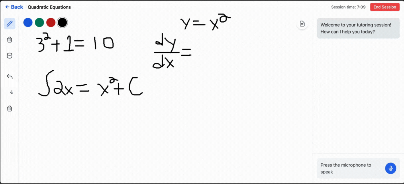 Our voice-driven AI tutoring platform combines natural conversation with a visual workspace, creating an experience that feels like sitting with a human tutor - at a fraction of the cost.